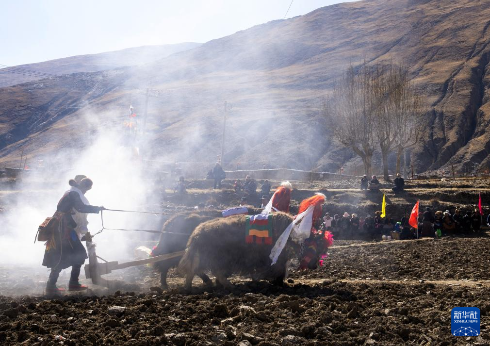 離村莊不遠(yuǎn)的一處農(nóng)田上,在百余名村民的注視下,12名壯年男子哼唱著古老的曲調(diào),驅(qū)趕耕牛耕出新年的第一犁。“農(nóng)業(yè)生產(chǎn)早就實(shí)現(xiàn)了機(jī)械化,之所以用傳統(tǒng)的‘二牛抬杠’來(lái)舉行開(kāi)耕儀式,是為了更好地傳承高原農(nóng)耕文化。”加麻村委員會(huì)主任土旦說(shuō)。